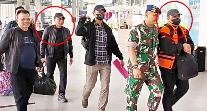 Edy Rahmayadi yang mengenakan jaket dan topi hitam, berjalan bersama istrinya, Nawal Lubis, di belakang Topan Ginting yang memakai rompi tahanan berwarna oranye khas Komisi Pemberantasan Korupsi (KPK) dan tangan diborgol. Momen ini menjadi pusat perhatian banyak penumpang dan warga yang berada di bandara.