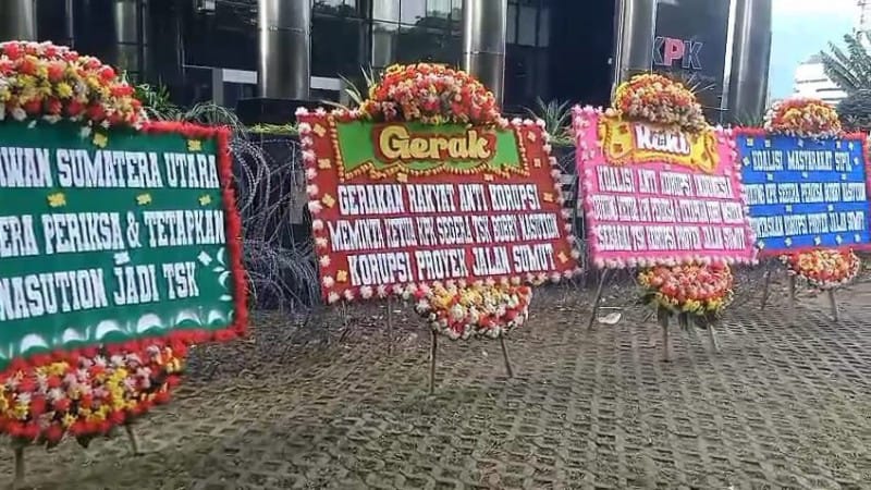 TRABASNEWS – Deretan karangan bunga dengan pesan tegas memenuhi halaman Gedung Merah Putih Komisi Pemberantasan Korupsi (KPK) di Jakarta pagi ini. Karangan bunga tersebut berisi desakan agar KPK segera memanggil dan memeriksa Gubernur Sumatera Utara, Bobby Nasution, terkait dugaan keterlibatannya dalam kasus korupsi proyek infrastruktur jalan di Sumut.