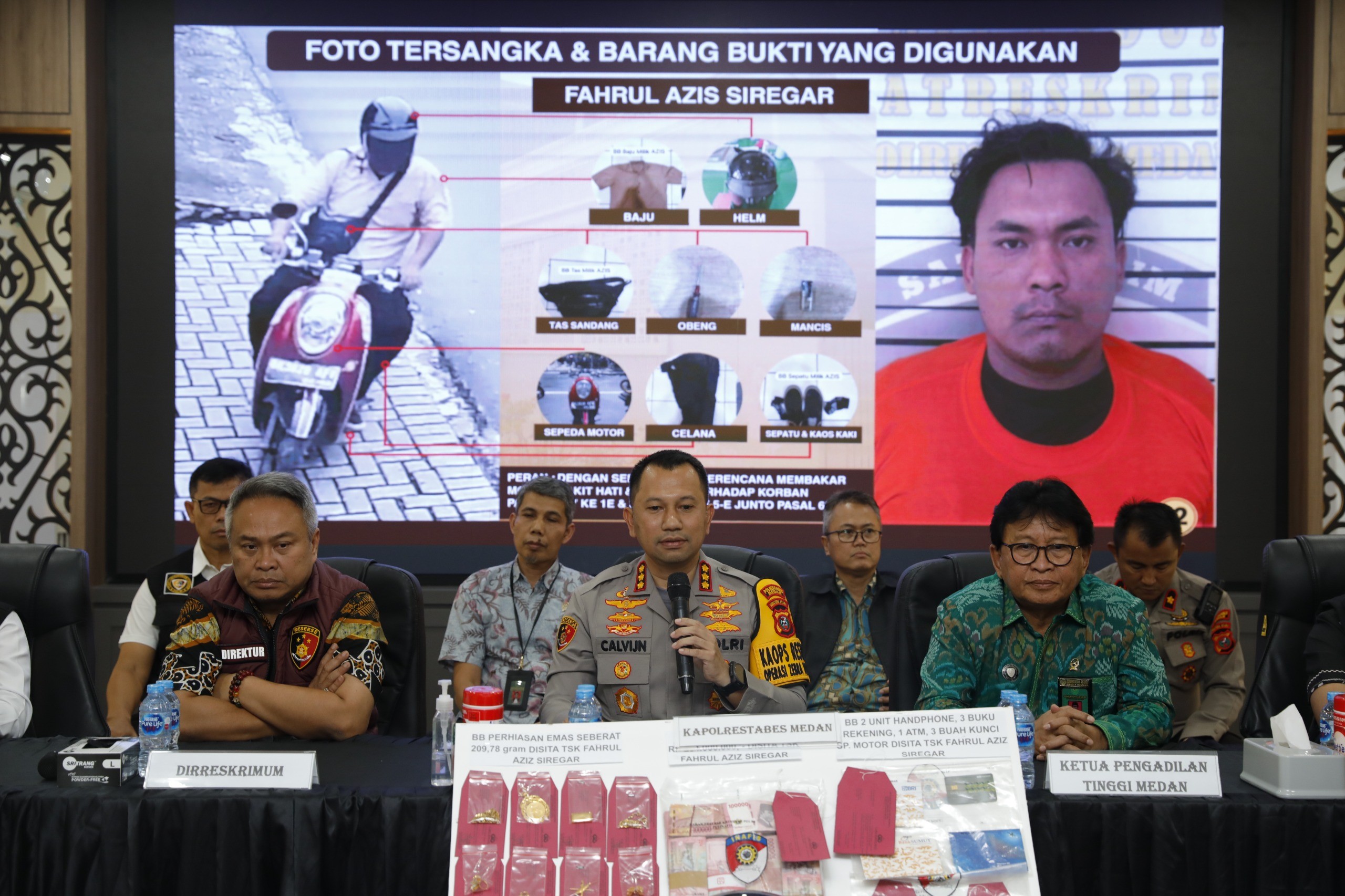 Barang bukti yang disita meliputi perhiasan emas, emas batangan, sepeda motor pelaku, serta sisa bahan bakar yang digunakan untuk membakar rumah.