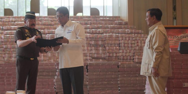 TRABASNEWS – Presiden Prabowo Subianto meninjau langsung uang sitaan senilai Rp 2 triliun, bagian dari total Rp 13,2 triliun hasil korupsi ekspor minyak sawit mentah (CPO) oleh tiga grup besar: Wilmar Group, Musim Mas Group, dan Permata Hijau Group. Peninjauan dilakukan di lobi Gedung Kejaksaan Agung, Jakarta Selatan.