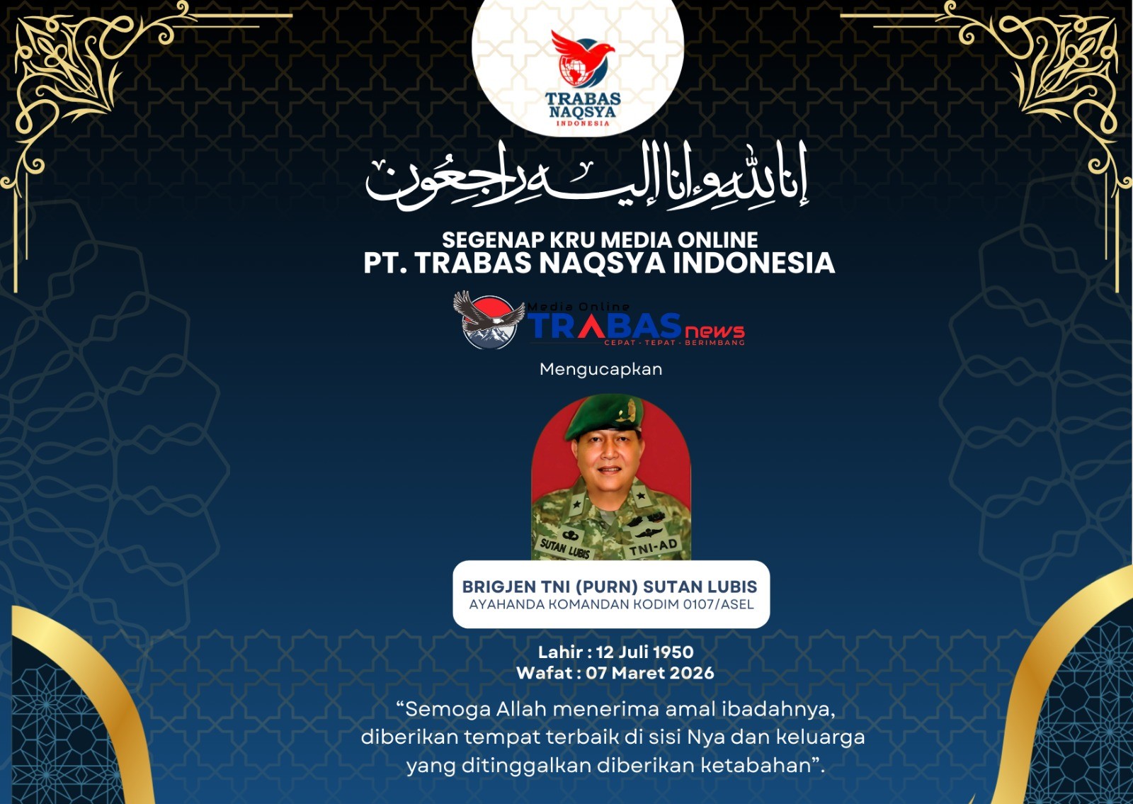 TRABASNEWS- Media online Trabasnews.com menyampaikan duka cita yang mendalam atas wafatnya Brigjen TNI (Purn.) H. Sutan Lubis, pada Sabtu (7/3/2026) di usia ke 76 tahun.